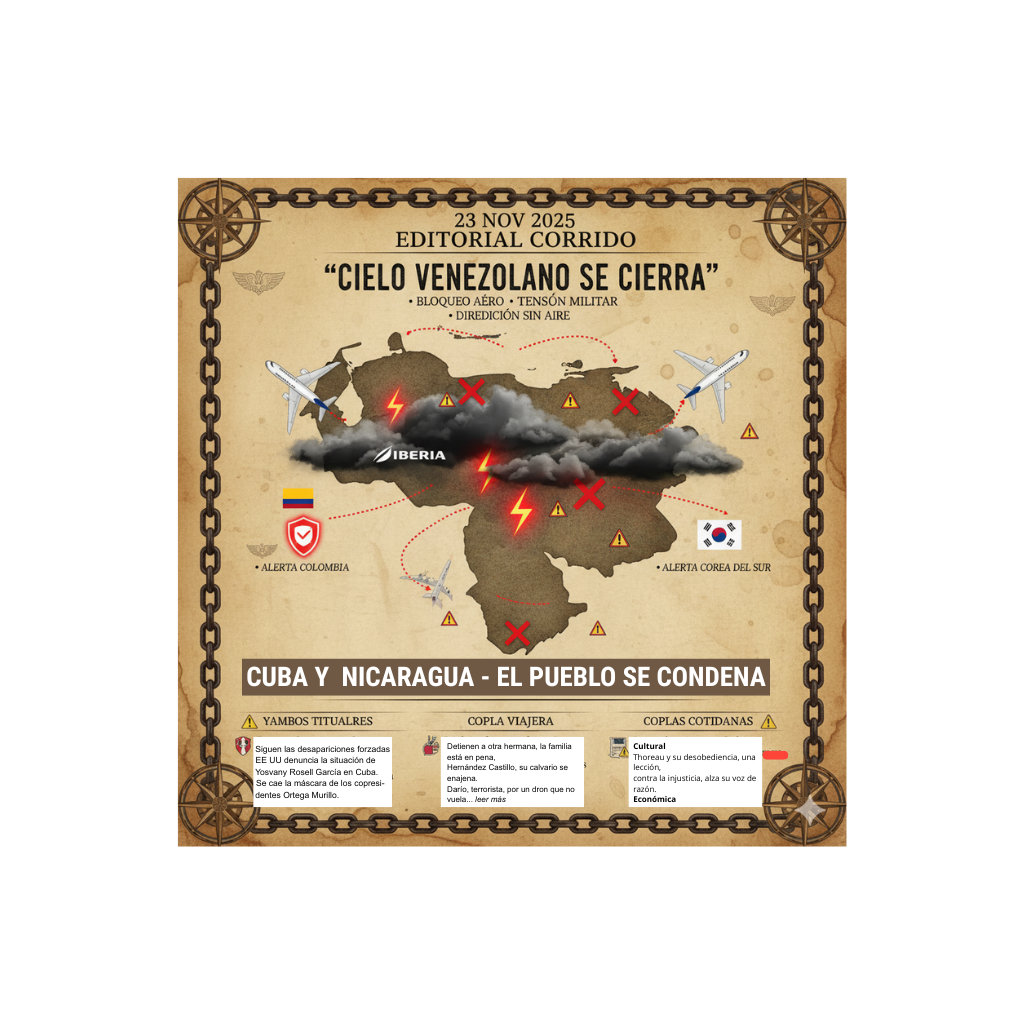 📻 Editorial Corrido – 23 de noviembre de 2025 Por La Cotorra Cancerbera, que no se calla ni bajo el agua. El cielo venezolano se cierra, Iberia y otras naves, de aquí se aferran. Un bloqueo aéreo, tensión que encierra, Colombia y Corea, en alerta, la tierra. De ataque militar, se oye la sirena, Precaución
