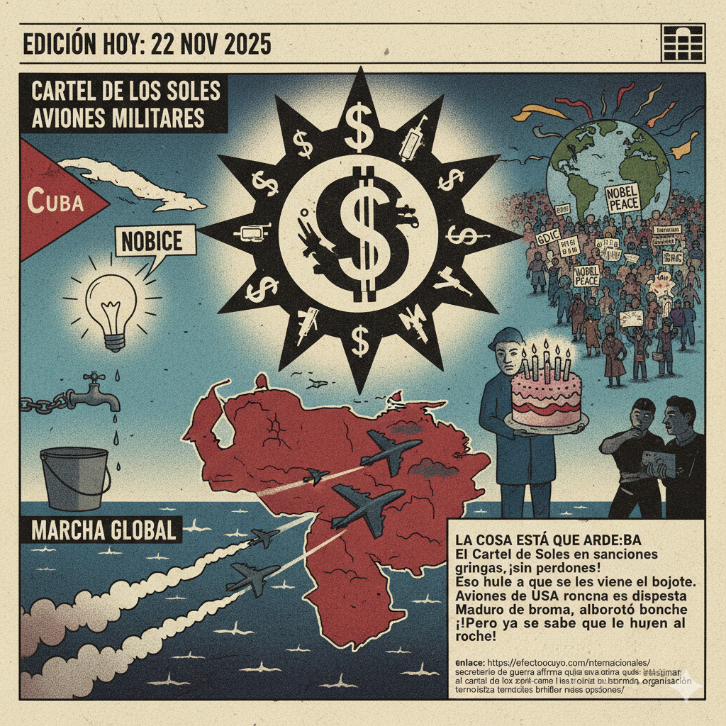 📻 Editorial Corrido – 22 d noviembre de 2025 Por La Cotorra Cancerbera, que no se calla ni bajo el agua. La cosa está demasiado tensa: El Cartel de los Soles con gringas sanciones , como organización terrorista abre nuevas opciones Aviones de USA roncan sin dispensa. Maduro jodiendo, alborotó un bonche! ¡Pero de aquí