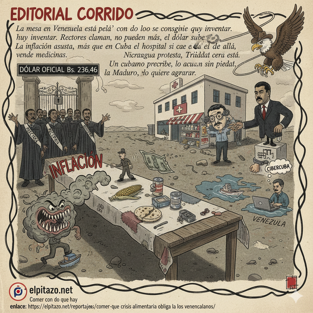 📻 Editorial Corrido – 16 de noviembre de 2025 Por La Cotorra Cancerbera, que no se calla ni bajo el agua. La mesa en Venezuela está pelá’, con lo que se consigue hay que inventar. Rectores claman, no pueden más, el dólar sube, no da pa’ na’. La inflación asusta, más que un marine, en