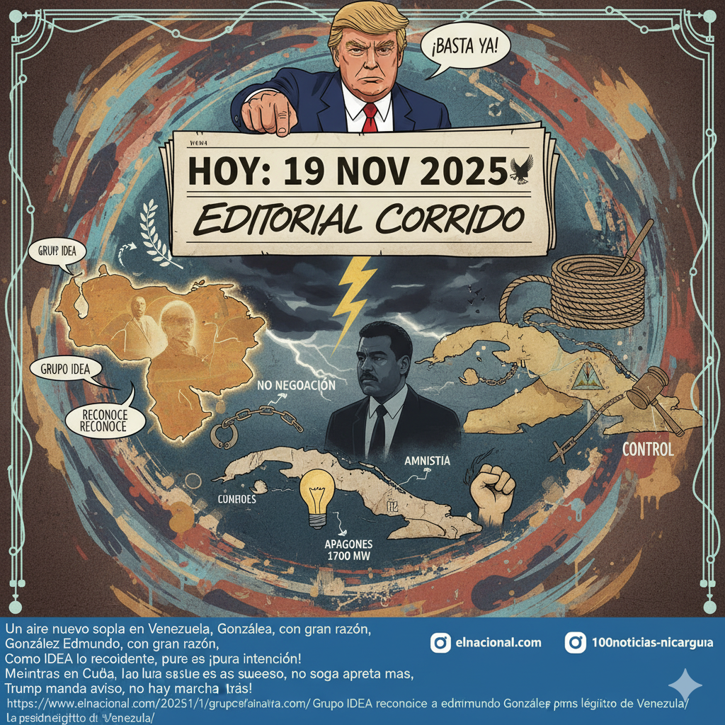📻 Editorial Corrido – 19 de noviembre de 2025 Por La Cotorra Cancerbera, que no se calla ni bajo el agua. Un aire nuevo sopla en Venezuela, González Edmundo, con gran razón, Grupo IDEA lo reconoce, sin más pela, Como presidente, ¡pura intención! Maduro en jaque, sin negociación, Petro le exige soltar al que esté