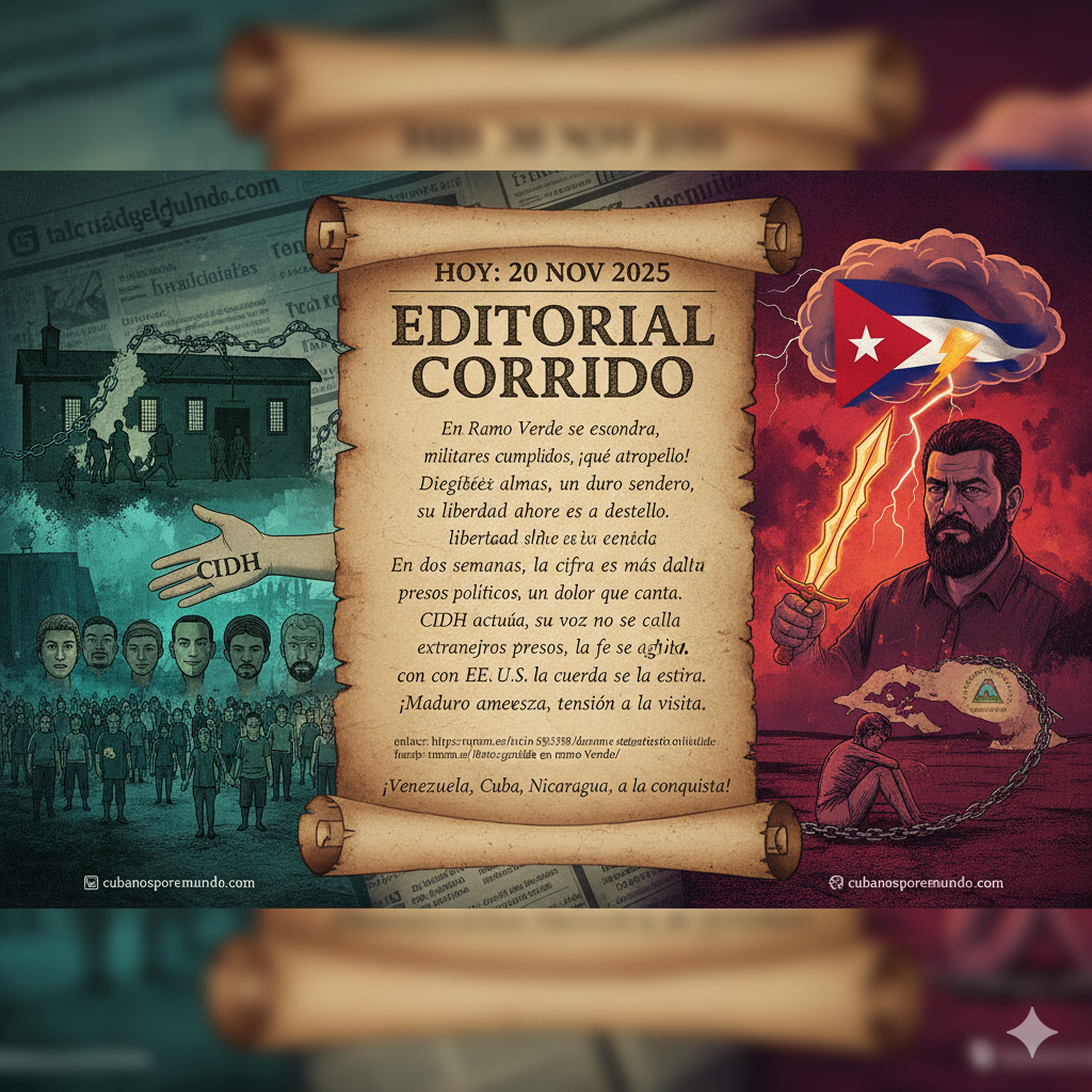 📻 Editorial Corrido – 20 de noviembre de 2025 Por La Cotorra Cancerbera, que no se calla ni bajo el agua. En Ramo Verde se esconde un misterio, militares cumplidos, ¡qué atropello! Dieciséis almas, un duro sendero, su libertad ahora es un destello. En dos semanas, la cifra es más alta, presos políticos, un dolor
