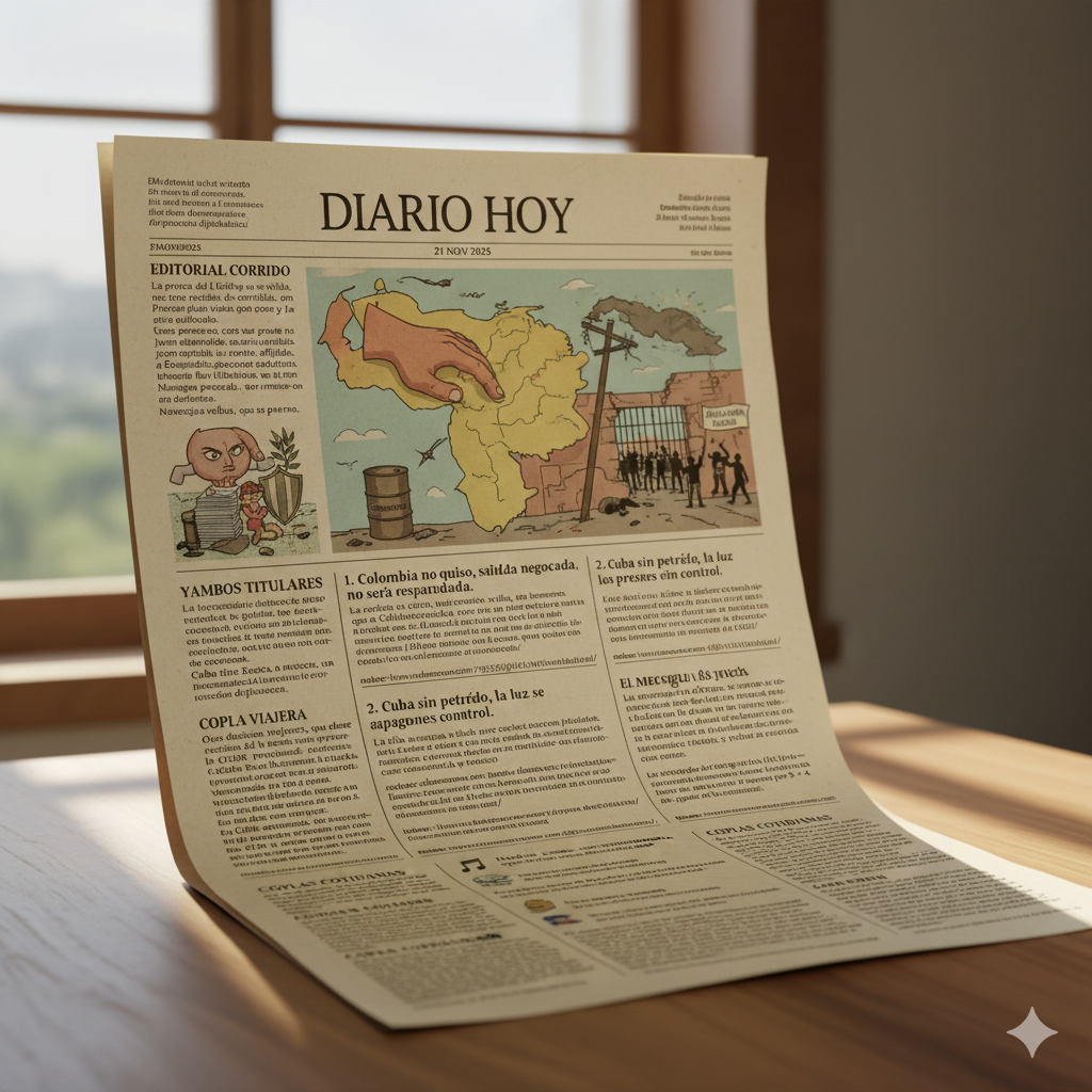 📻 Editorial Corrido – 21 de noviembre de 2025 Por La Cotorra Cancerbera, que no se calla ni bajo el agua. La prensa del Editorial no se calla, hoy les vengo a cantar lo que no es cuento, Venezuela pasa susto, qué tormento, y en Cuba la luz, se la lleva la malla. Tres perecen,