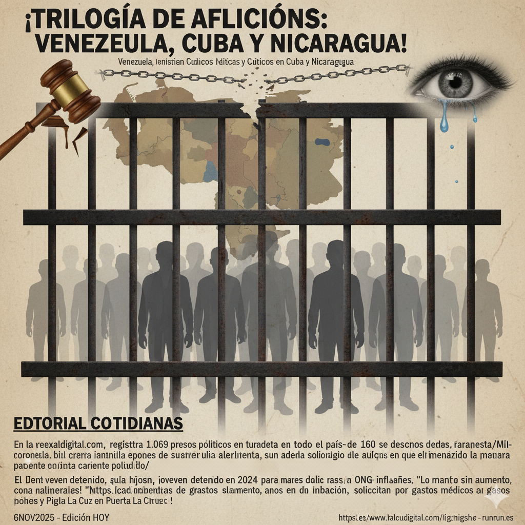 📻 Editorial Corrido – 6 de noviembre de 2025 Por La Cotorra Cancerbera, que no se calla ni bajo el agua. Mil presos políticos van contados por una ONG, y de 160 no se sabe el qué, ni dónde los encontrarán. En audiencia telemática están, ocho sin defensa, ¡qué feo! Un teniente coronel, sin deseo,