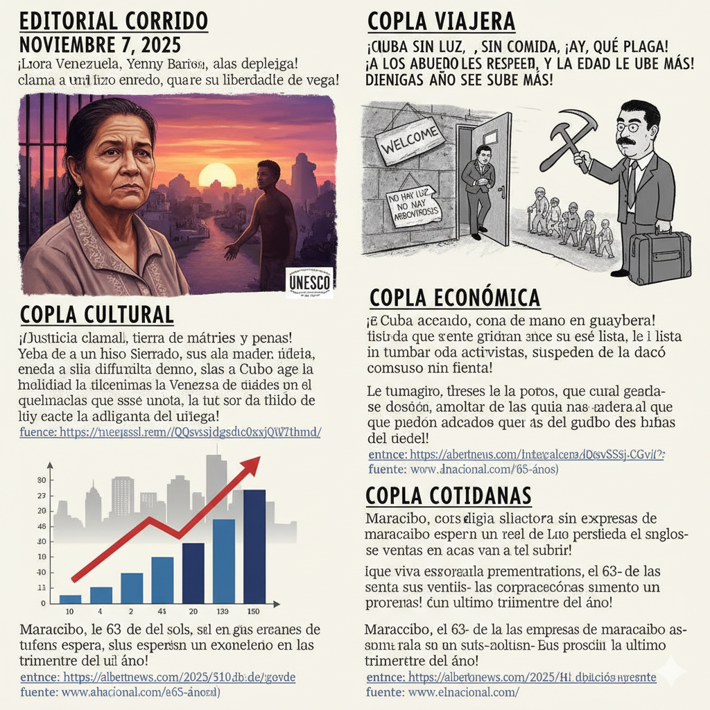 📻 Editorial Corrido – 7 de noviembre de 2025 Por La Cotorra Cancerbera, que no se calla ni bajo el agua. Llora Venezuela entera, Yenny Barrios se nos fue, ¡qué dolor tan grande, que el alma nos hiere! Clama su hijo en prisión, con el corazón apretao, que lo dejen despedirse, de ese amor tan